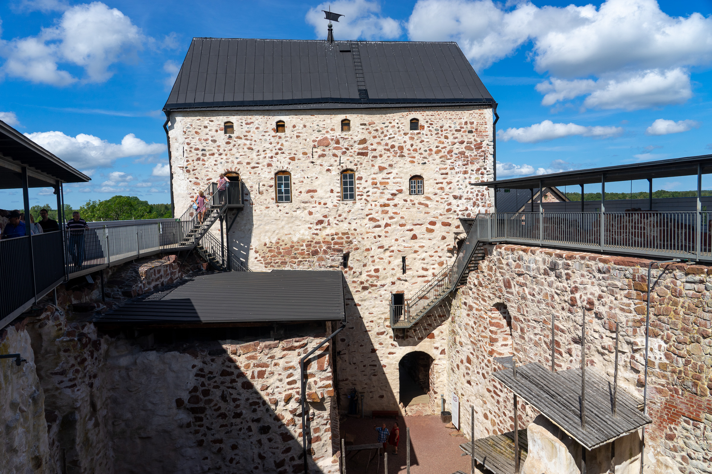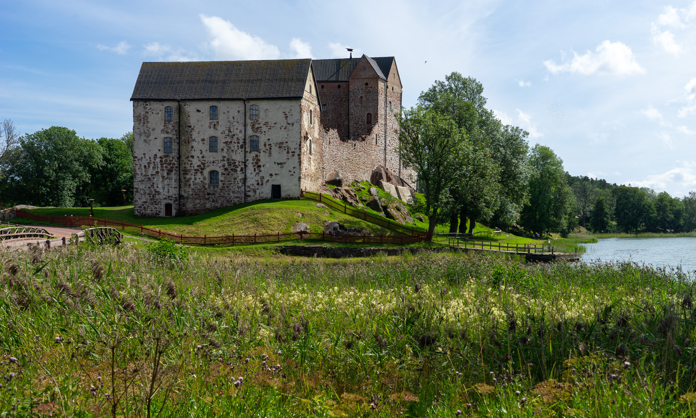 Als es tags darauf wieder trocken ist, steigen wir aufs Rad. Vom Traditionsseglerhafen über die St. Olaf’s Kirche bis zurück nach Kastelholm, diesmal zur Schlossbesichtigung mit Führung durch das mittelalterliche Leben. Knapp 70 Kilometer kommen zusammen. Die Landschaft ist nicht spektakulär, aber abwechslungsreich. Felder, kleine Straßen, immer wieder Wasser. Am Ende sind wir zufrieden – und spüren die Strecke.