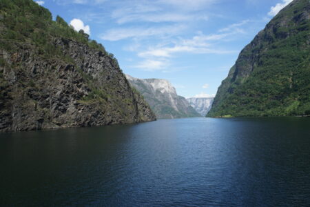 In Gudvangen stiegen wir auf ein elektrisch betriebenes Schiff um, das uns durch den Nærøyfjord und weiter durch den Aurlandsfjord nach Flåm brachte. Das Wetter zeigte sich von der freundlichen Seite, die Fjorde waren überwältigend. Die Eindrücke sind kaum auf Fotos festzuhalten, man muss es selbst erlebt haben. Vor der Abfahrt mit der Flåmbahn haben wir noch Wikingermenü mit Bierverkostung genossen – sehr touristisch aber trotzdem ganz nett.