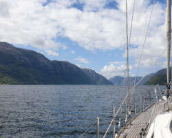 The following day the weather showed a more favourable side. We set off and passed Preikestolen and the Whisky Falls, heading deep into the Lysefjord as far as Lysebotn. The berth there demanded our full attention for the first two to three hours: there was very little water under the keel. We monitored the depth continuously and compared it with the tide tables. When things became critical, we warped Anori a little further and remained ready to leave again at any moment if necessary. In the end, everything worked out – just enough.