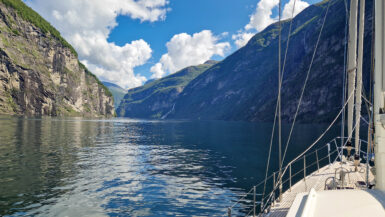 Von Hareid aus geht es für uns weiter nach Norddal. In Norddal probieren wir zum ersten Mal unser Angelglück – Klaus legt direkt vor: Ein schöner Pollack zappelt am Haken und landet am Abend frisch in der Pfanne. Ein guter Auftakt. Am nächsten Tag nehmen wir Kurs auf den Geirangerfjord...